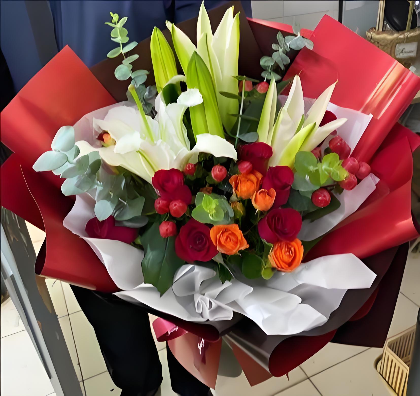 郴州花店包11枝红玫瑰、2枝多头白百合、6枝橙色多头玫瑰、红豆、尤加利叶